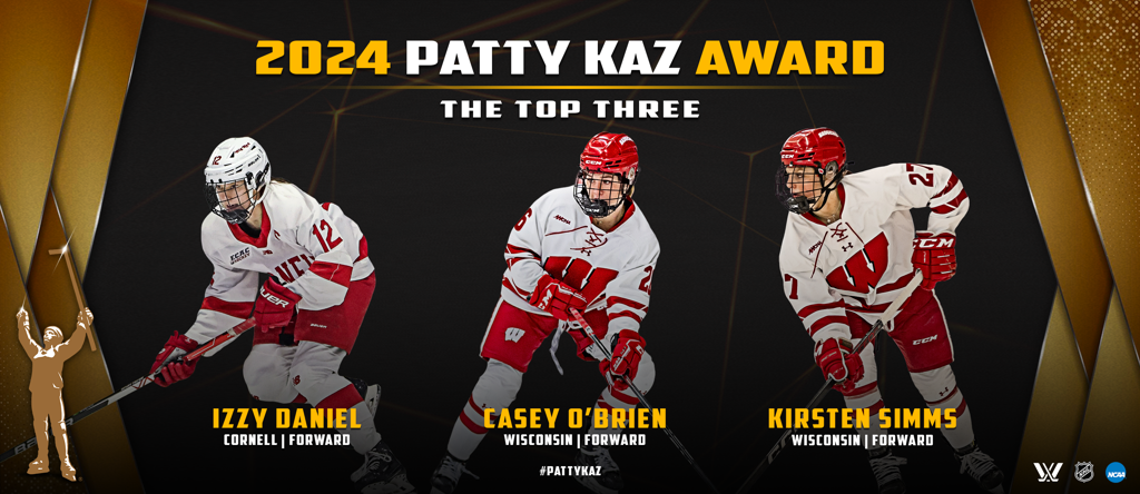 COLORADO SPRINGS, Colo. – Izzy Daniel (Minneapolis, Minn./Cornell University), Casey O’Brien (Milton, Mass./University of Wisconsin) and Kirsten Simms (Plymouth, Mich./University of Wisconsin) have been named the 2024 Patty Kazmaier Memorial Award Top-Three Finalists it was announced today by The USA Hockey Foundation.